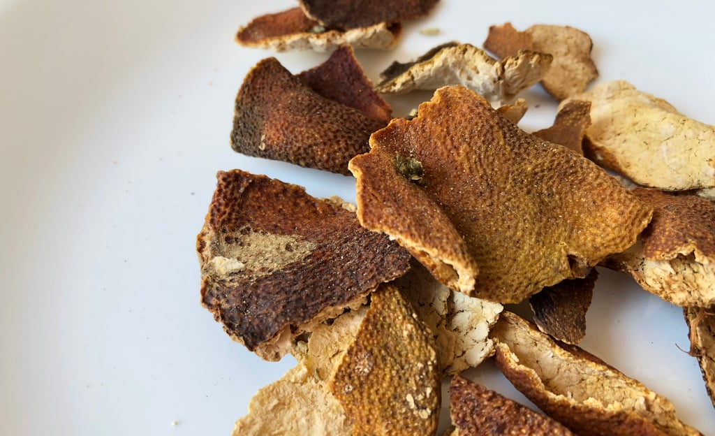Growing up, my mom would save the peel after eating an orange or tangerine and set in on a newspaper on top of our fridge to dry. Once dry, she would use it stews and braises alongside other spices. To make your own, just set aside orange peels to dry. Over time, the dried peels will naturally darken. These add flavor to dishes like orange chicken or this vegan ma la xiang guo (spicy numbing stir-fry).